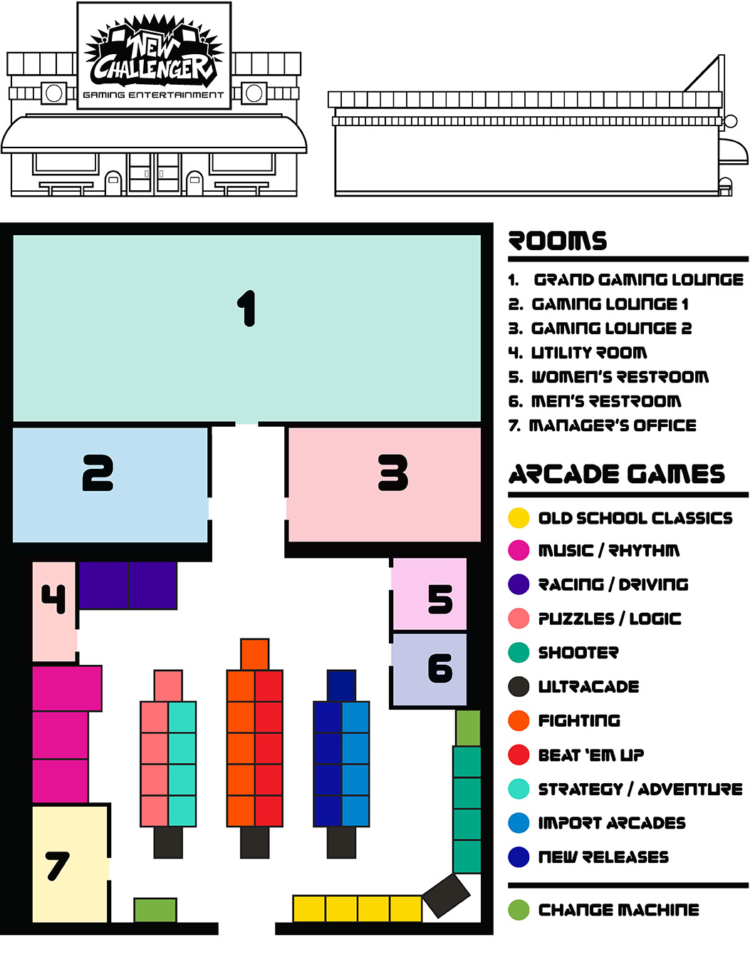 Creating a physical building concept presents a solid visual of the arcade setting. The exterior of the building includes the façade and the side. The interior shows the floor plan along with the arrangement of the arcades and gaming rooms. A color code is added to represent the type of games available at the establishment.