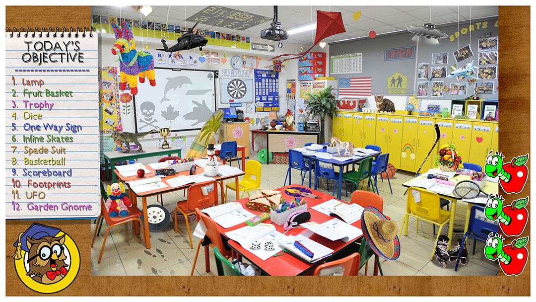 The play-through presents a photo containing a multitude of random items. The list of items that players need to find is shown on the top left. The owl at the bottom left provides limited hints if the player is finding difficulty in the game. The three worms will assist the player if he/she is unable to find a particular item. Players must be careful because he/she will only have three assistance per play-through. The descending green meter at the bottom represents the time. If the player can find all the items listed before time runs out, he/she will advance to the next photo. If not, then the game is over and the player will return the title screen.