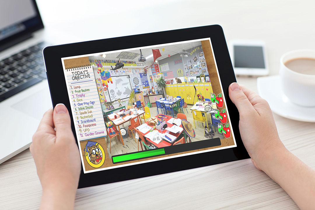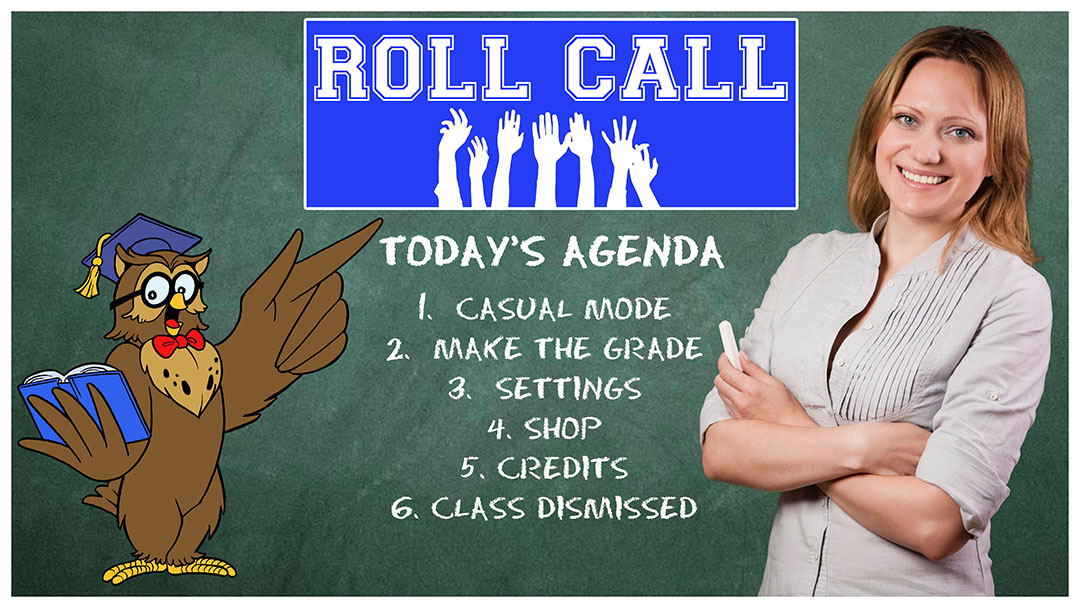 The title screen consist of six available options for the player. CASUAL MODE is a non-timed exhibition for younger or novice players. MAKE THE GRADE is a timed search-and-find game for older or competitive players. SETTINGS changes certain attributes of the game such as number of hints, amount of time, etc. SHOP is an online feature to acquire downloadable content. CREDITS simply show all contributors to the game. CLASS DISMISSED exits the game.